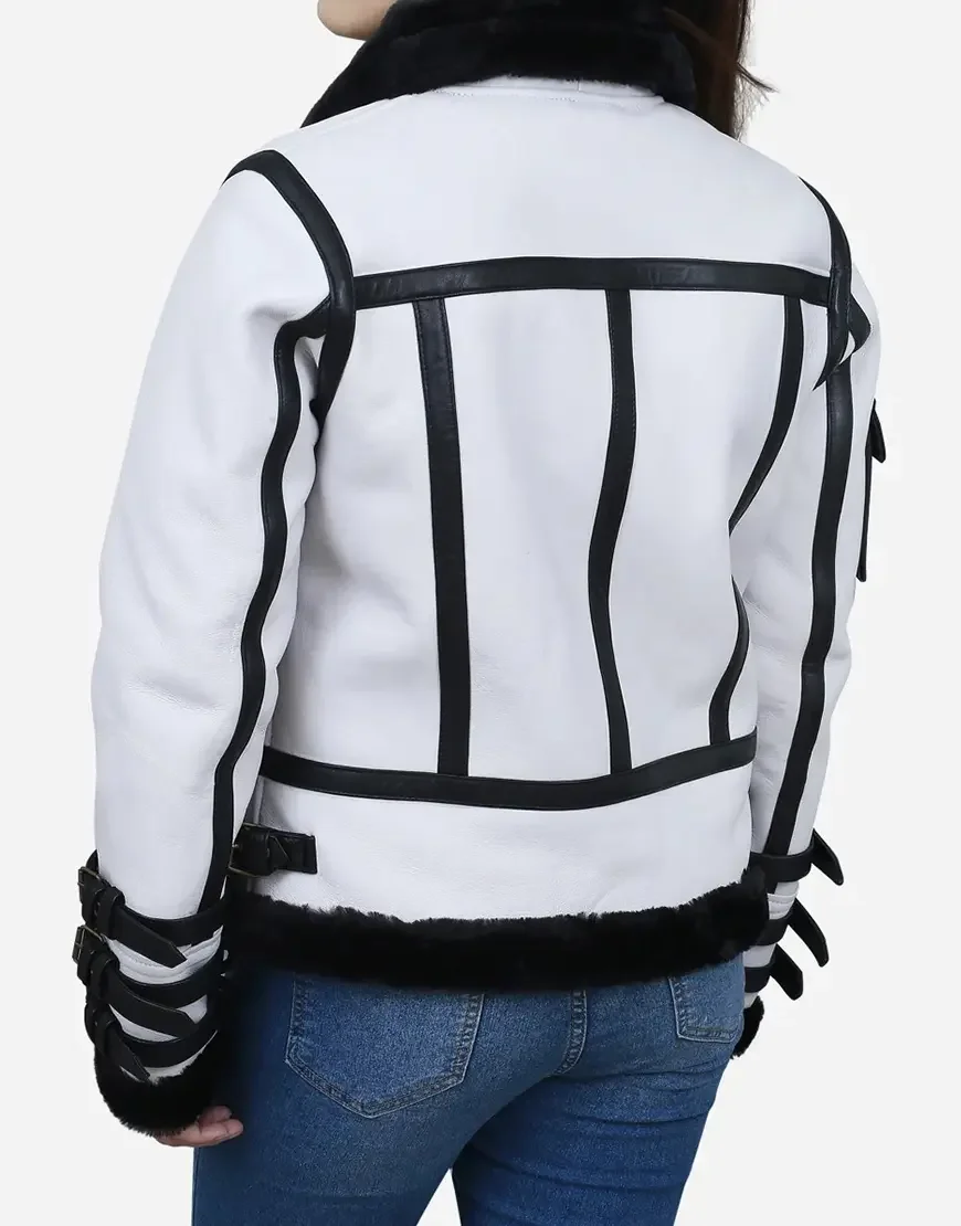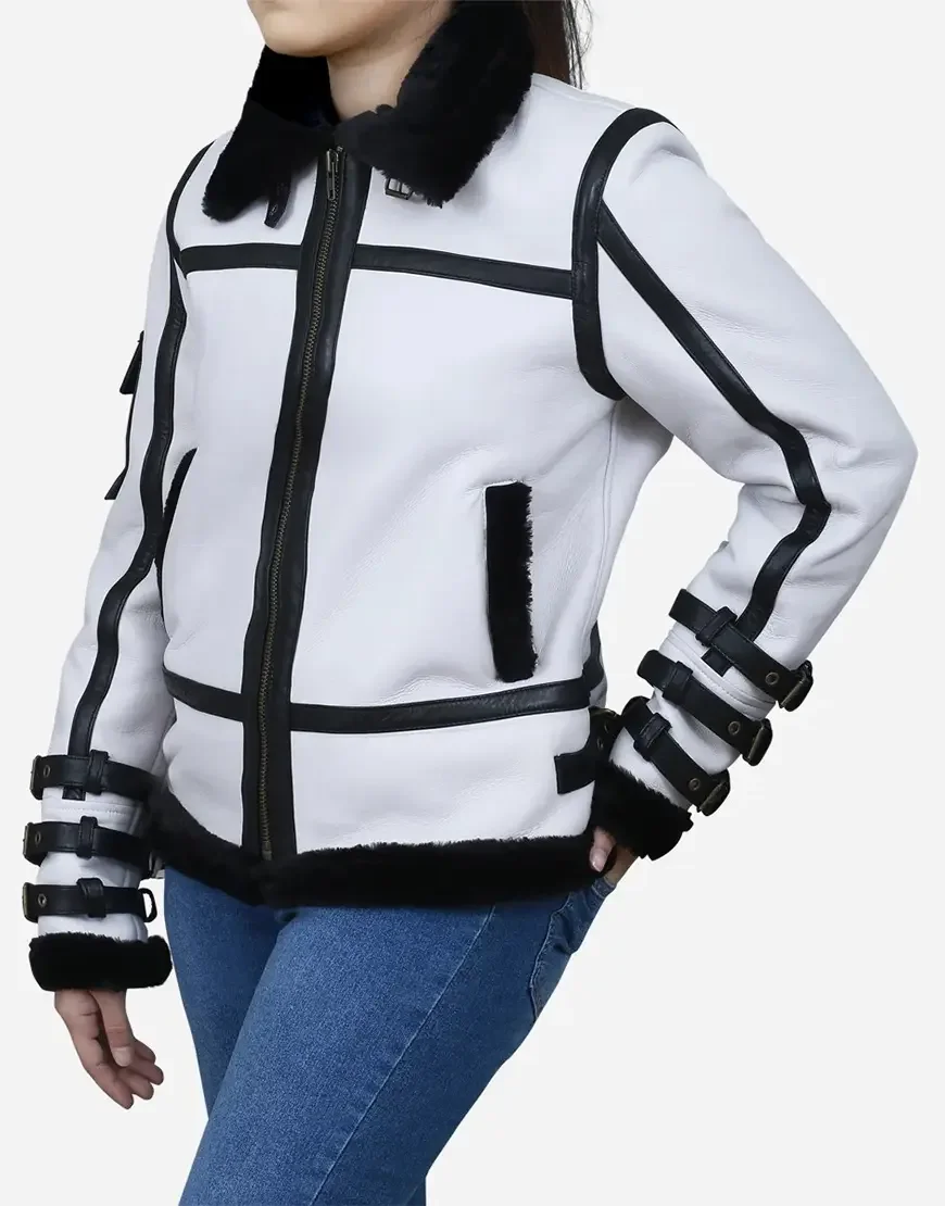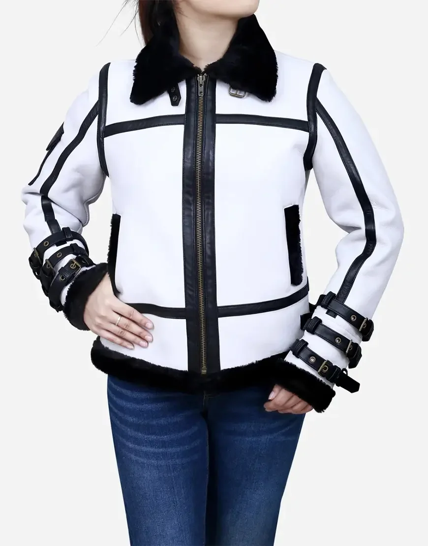 This jacket is absolutely stunning! The white leather gives it such a classy and luxurious look, and the shearling lining keeps me incredibly warm.