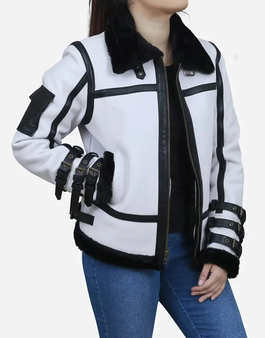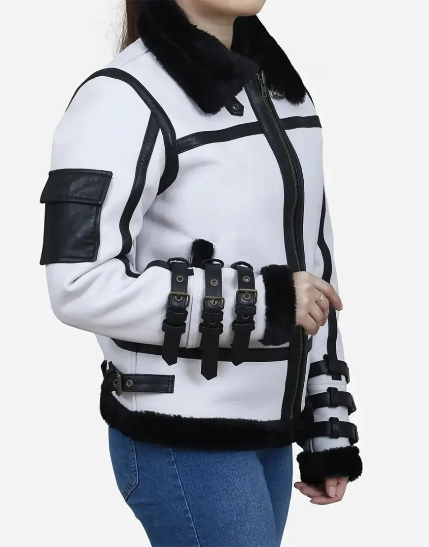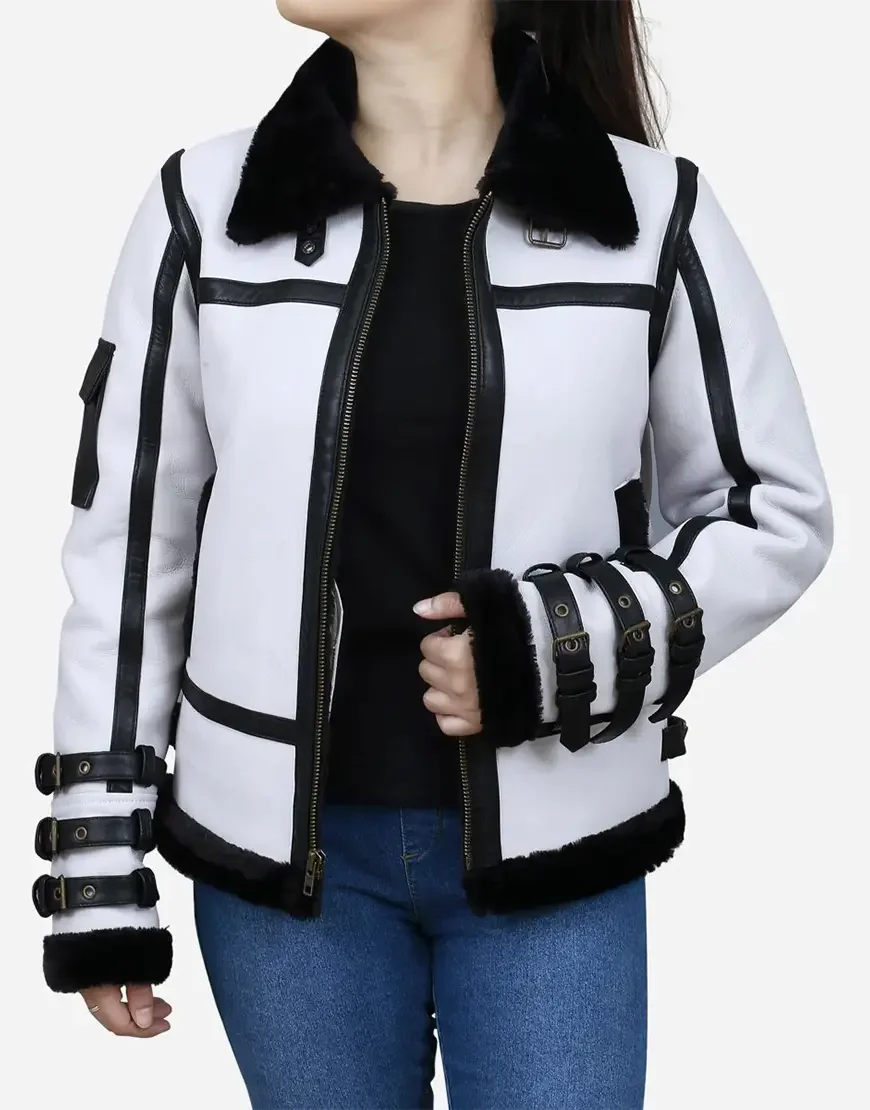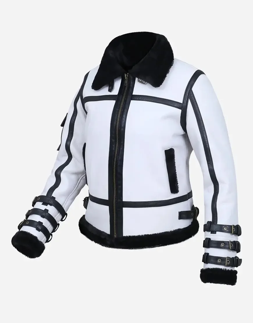 This jacket is absolutely stunning! The white leather gives it such a classy and luxurious look, and the shearling lining keeps me incredibly warm.