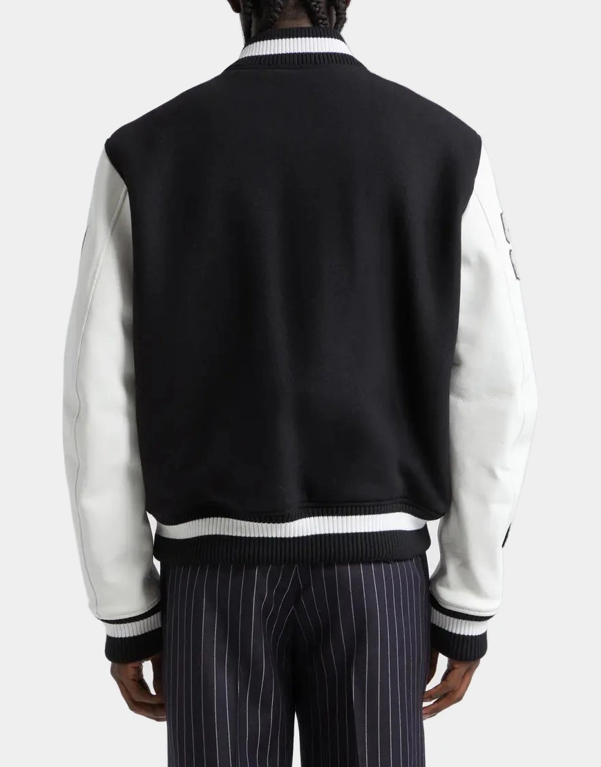 Uplift your style with the Leather & Virgin Wool Blend Varsity Jacket, a perfect blend of luxury and style. This jacket stands out with its high-contrast logo patches on the front and rich leather sleeves, offering a contemporary twist on a classic varsity silhouette.