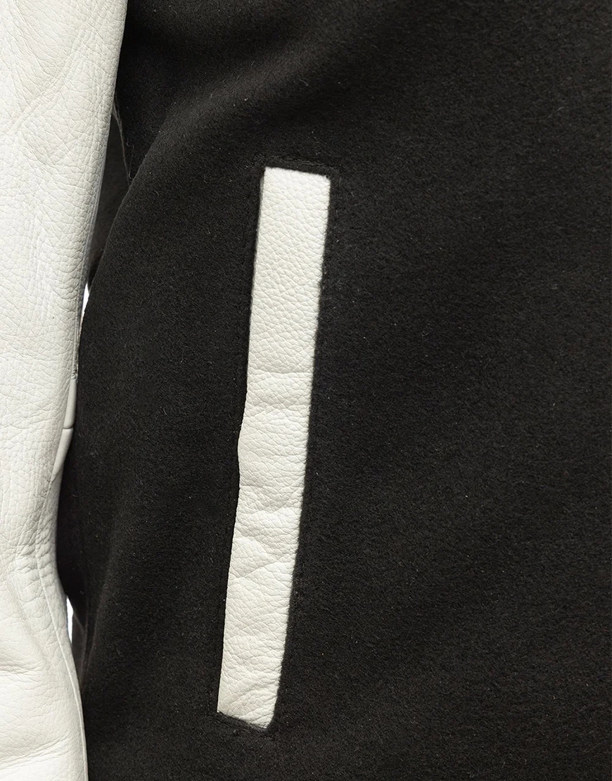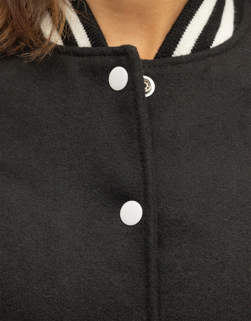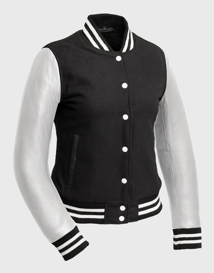 Make a bold statement with Sarah- women varsity jacket that features black and white pattern with astonish look giving you a bold vibe. You have the option to get embroidered or appliqué details such as, symbols, logos, or numbers.