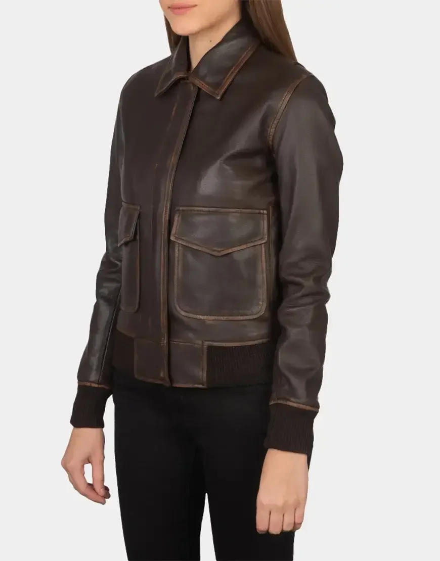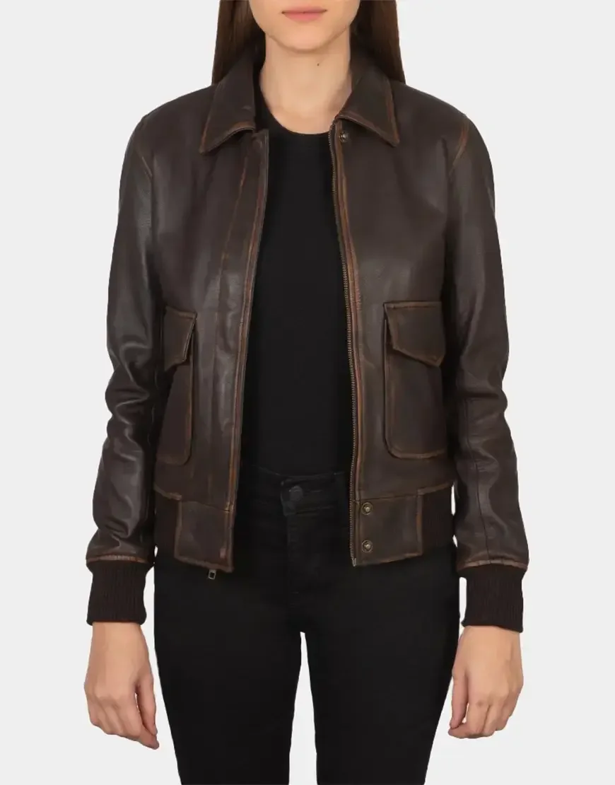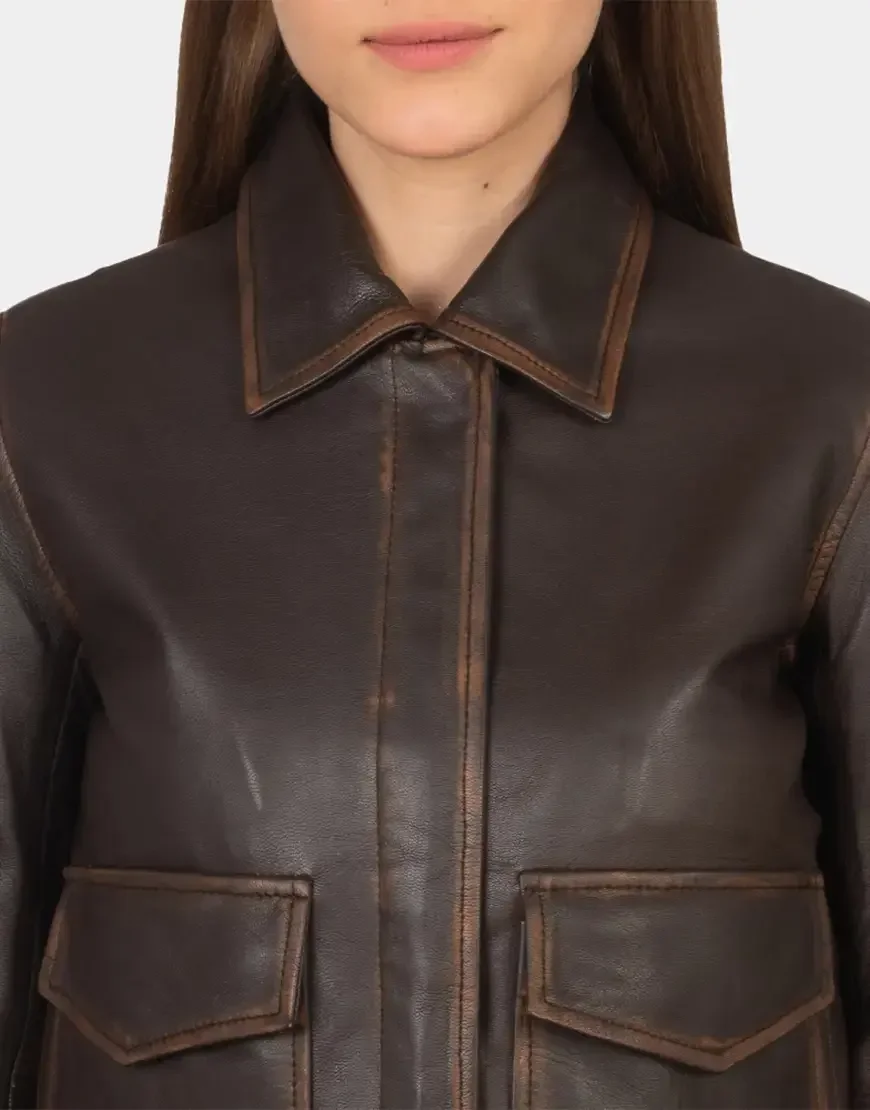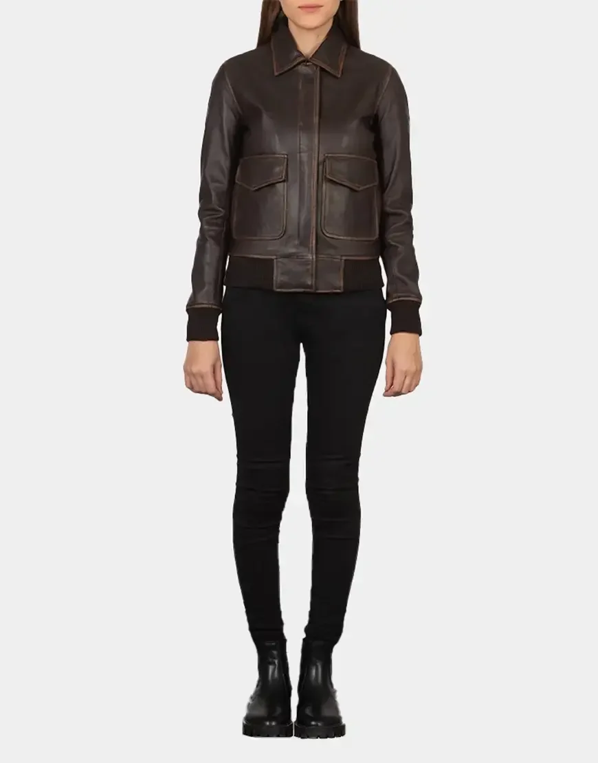 This women’s brown leather bomber jacket features zippered closure with a button flap, four exterior pockets and two interior pockets. The six pockets in total offer ample space to keep your essentials.