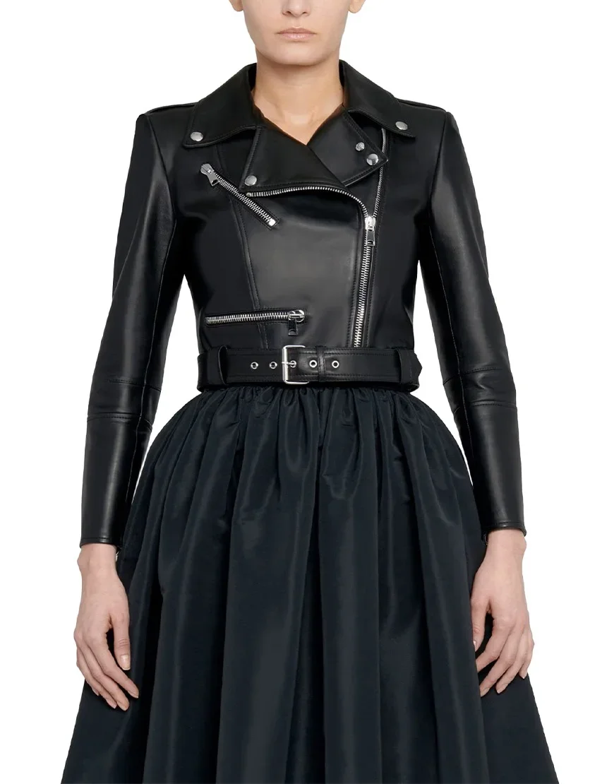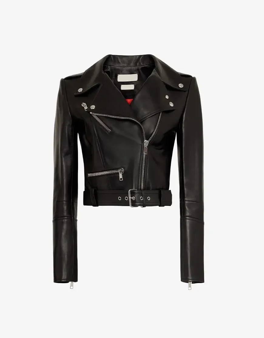 This Cropped Leather Jacket is designed to make you look fit featuring a sleek zipped fastening with belted waist that fits your figure. This black leather crop jacket does not only look stylish but also enhances your outfit appeal.