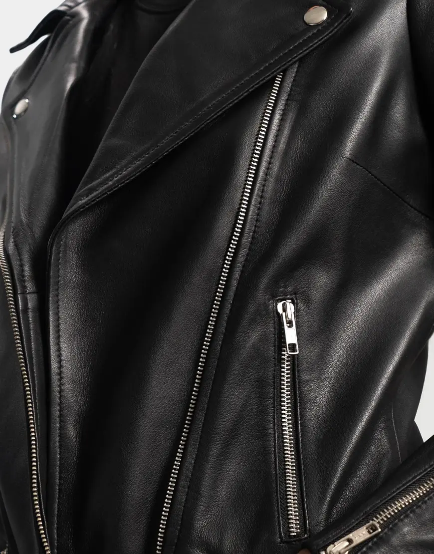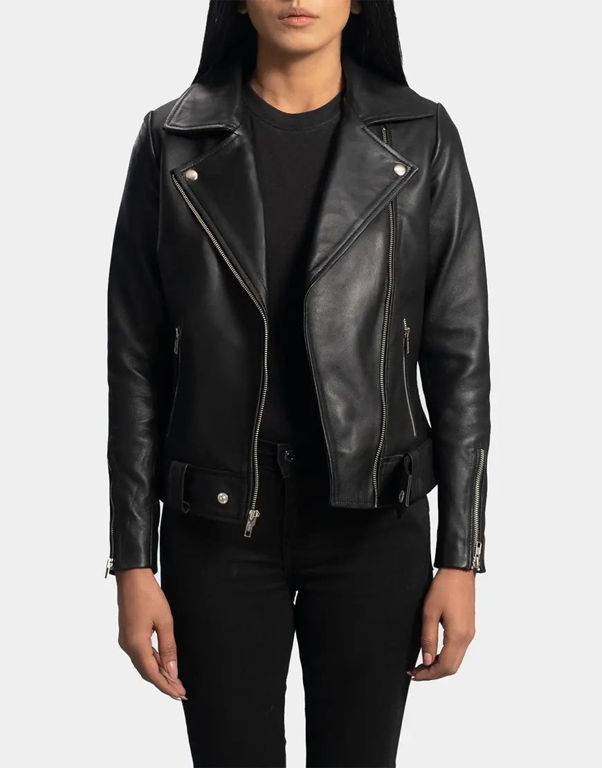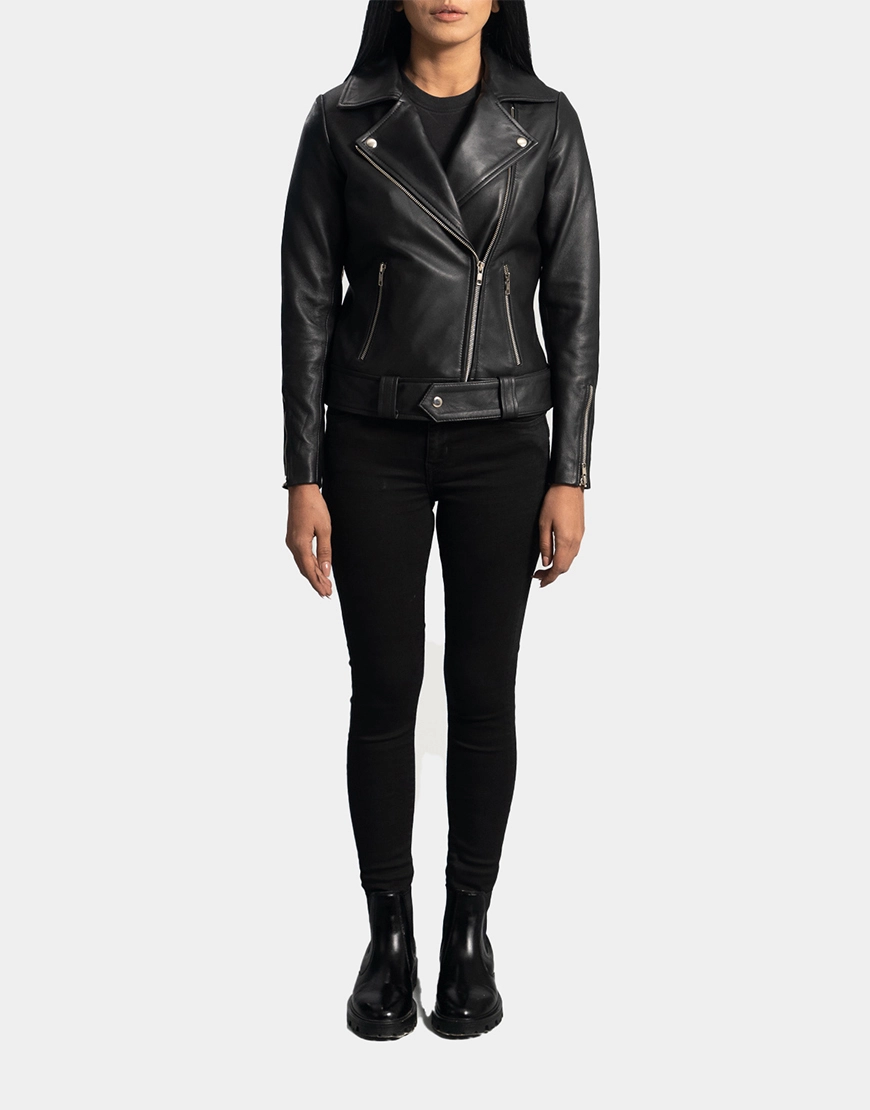 Command attention with the Rumy Black Leather Biker Jacket, a must-have for every fashion-forward individual. Expertly crafted from premium Cowhide leather with a semi-aniline finish, this black leather biker jackets for women offers both durability and a sleek, luxurious look.